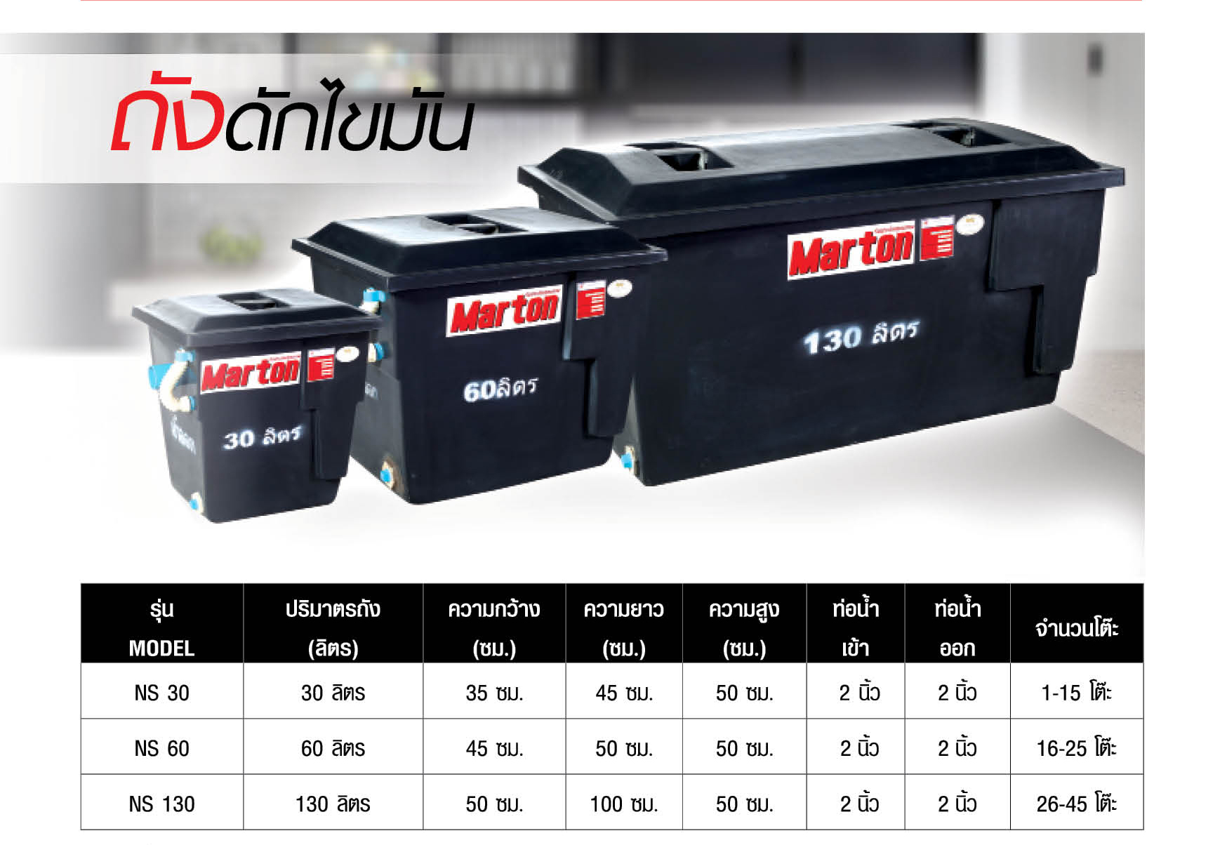 - รุ่น NS30 ปริมาตรถัง 30 ลิตร ความกว้าง 35 ซม. ความยาว 45 ซม. ความสูง 50 ซม. ท่อน้ำเข้า 2 นิ้ว ท่อน้ำออก 2 นิ้ว รองรับจำนวนโต๊ะได้ประมาน 1-15 โต๊ะ